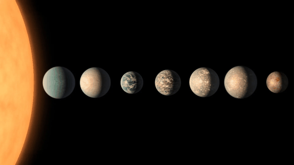 艺术家根据行星直径、质量及与宿主恒星的距离等现有数据绘制的特拉普派- 1行星系构想图,从左至右依次为特拉普派- 1的a、b、c、d、e、f、g、h行星。其中,d、e、f、g行星被认为与地球最为相似。图片来源:NASA/JPL-Caltech