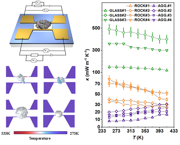 团队通过自主设计的悬臂式H型微纳热桥装置,在高真空环境下完成精准测试, 发现253K时胶结物热导率低至8 mW・m⁻¹・K⁻¹,较岩屑低3-5倍、较玻璃珠低1-2个数量级, 且其热导率随温度升高略有上升,与岩屑、玻璃珠的变化规律相反,这一特性源于其非晶质结构与高温下的辐射传热增强。