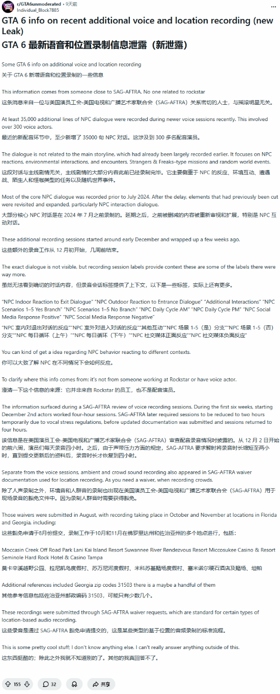 据介绍,在最近的新一轮语音录制中,至少新增录制了约35000条NPC对话,涉及超过300名配音演员。这些对话与主线剧情无关(主线内容早已基本录制完成), 主要集中在NPC反应、环境互动、遭遇事件,以及类似“陌生人与怪咖”(Strangers & Freaks)的任务和随机世界事件上。