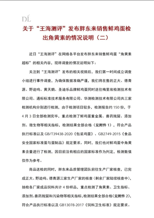 速读:胖东来发布情况说明胖东来发布情况说明_东方财富网。 4月5日,胖东来商贸集团有限公司通过其抖音官方账号发布《关于“王海测评”发布胖东来销售鲜鸡蛋检出角黄素的详细情况说明》。 据此前媒体报道,3月13日,博主“王海测评”称,胖东来超市的鸡蛋检测出一种名为角黄素(斑蝥黄)的人工色素,含量为9.54mg/kg,超出农业农村部发布的《饲料添加剂安全使用规范》蛋禽类饲料中斑蝥黄允许的最大添加量8mg/kg。 3月15日,胖东来曾发文回应关于博主“王海测评”发布其销售鲜鸡蛋检出角黄素一事,称目前市场监管部门的相关调查以及第三方复检还未出结果,如果最终的调查结果显示鲜鸡蛋存在问题,会第一时间公示结果,并立即启动下架召回程序,依法承担相应法律责任。 胖东来在声明中称,“王海测评”在未向公司核实、也无官方结论的情况下,使用“染色蛋”、“超限量”等误导性表述发布视频,混淆了饲料添加剂标准与食品标准,不仅误导了公众,也对相关品牌及市场秩序造成了不良影响。