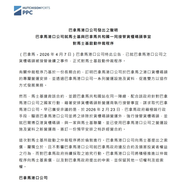 4月7日,香港长江和记实业有限公司旗下巴拿马 港口 公司发声明称,已就巴拿马 港口 公司之货柜码头被接管后续之事件,正式对全球 航运 巨头马士基启动仲裁程序。
