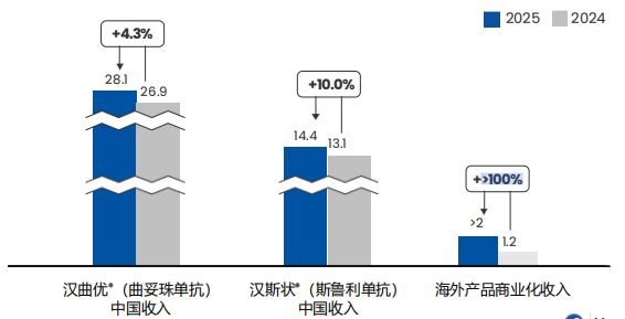 2025年,复宏汉霖的产品总收入约57.75亿元,同比增长17.0%。其中,HER2单抗药物曲妥珠单抗(商品名:汉曲优)仍是公司的现金牛产品,在国内的收入同比增长4.3%,达到28.09亿元,其在欧盟、美国获批的同款产品Zercepac和Hercessi销售合计1.55亿元。