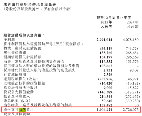 值得注意的是,财报显示,公司2025年股份支付薪酬费用为19.04亿元,较2024年的27.26亿元有所回落。