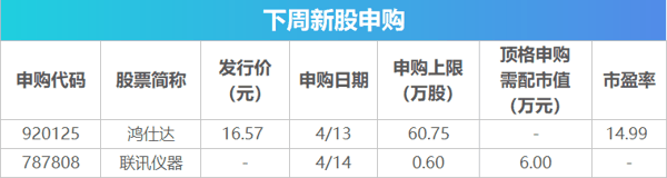 Wind数据显示,下周将有2只新股发行,具体来看,4月13日发行的是北交所 鸿仕达 ;4月14日发行的是科创板 联讯仪器 。此外,下周还有1只新股上市, 创达新材 将于4月13日在北交所上市。