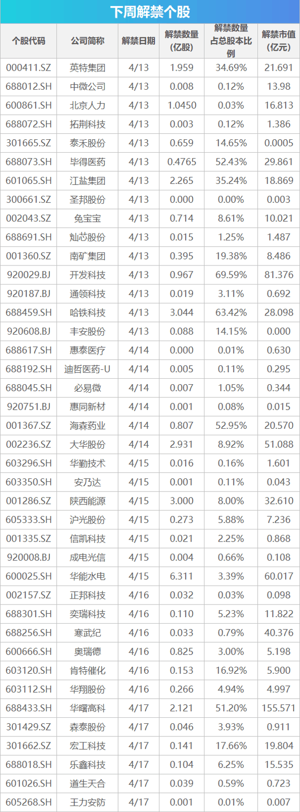 从解禁市值来看,4月13日是解禁高峰期,15家公司解禁市值合计240.48亿元,占下周解禁规模的35.56%。按4月10日收盘价计算,解禁市值居前三位的是: 华曙高科 (155.57亿元)、 开发科技 (81.38亿元)、 华能水电 (60.02亿元)。从个股的解禁量看,解禁股数居前三位的是: 华能水电 (6.31亿股)、 哈铁科技 (3.04亿股)、 陕西能源 (3亿股)。