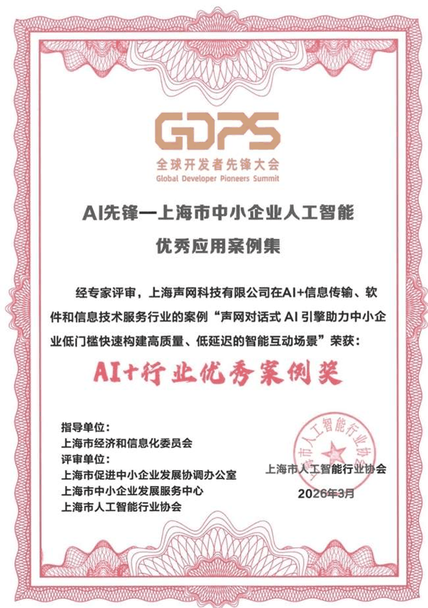 本次获奖不仅是对声网在 RTE +AI 融合领域技术实力的高度认可,也彰显了其助力中小企业低成本、高效率落地智能交互能力的平台价值。