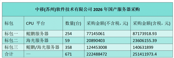 C114讯 4月7日消息(九九)中国移动采购与招标网日前发布《中移(苏州)软件技术有限公司2026年国产服务器框架(第一批次)采购项目招标公告》,采购内容为671台国产服务器,预算总金额约2.5亿元。
