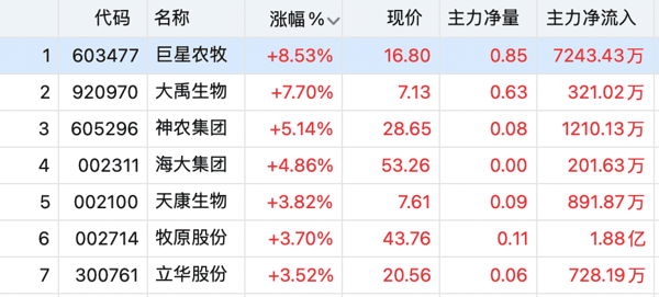 个股方面, 牧原股份 涨3.7%,现报43.76元/股,最新市值达2501亿元; 巨星农牧 涨超8%, 大禹生物 涨超7%, 神农集团 、 华统股份 、 海大集团 等跟涨。