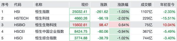 港股市场涨跌不一,恒生生物科技指数上涨。截至发稿,恒生指数跌超1%,恒生科技指数跌超2%,恒生生物科技上涨0.64%。个股方面, 再鼎医药 、 诺诚健华 、 金斯瑞生物科技 、 翰森制药 、 康哲药业 等纷纷上涨,而 华虹半导体 跌逾4%,小米集团、 中芯国际 、 阿里巴巴 均跌超3%。