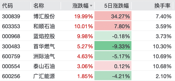 个股方面, 博汇股份 录得20cm涨停, 杰瑞股份 、 和顺石油 、 蓝焰控股 、 贝肯能源 均录得10cm涨停, 科力股份 、 中曼石油 、 通源石油 、 首华燃气 等纷纷上涨。