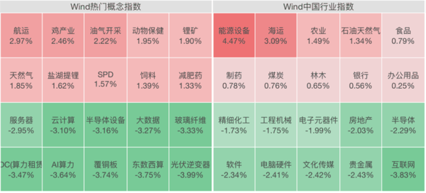 盘面上, 猪肉概念 板块强势反弹,油气、海运、能源设备等板块领涨, 创新药 板块延续强势,而 贵金属 、 通信服务 、 玻璃玻纤 等板块跌幅居前。