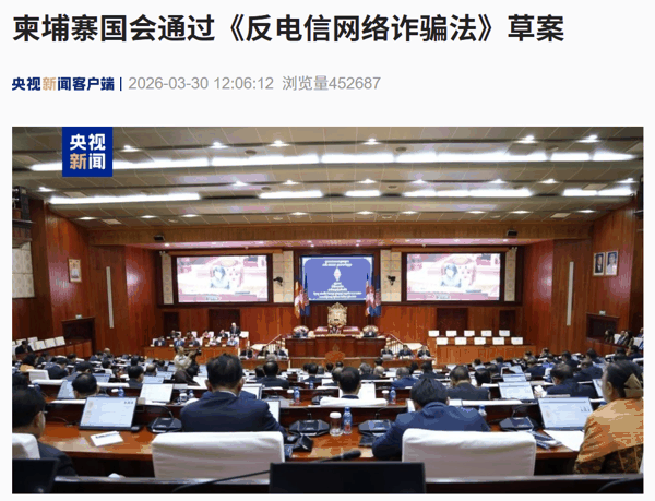 IT之家 3 月 30 日消息,据央视新闻今日报道,当地时间 3 月 30 日上午,柬埔寨国会召开全体会议,审议并通过《反电信网络诈骗法》草案。 当天共有 112 名议员出席会议,该草案在表决中获得全票支持 。