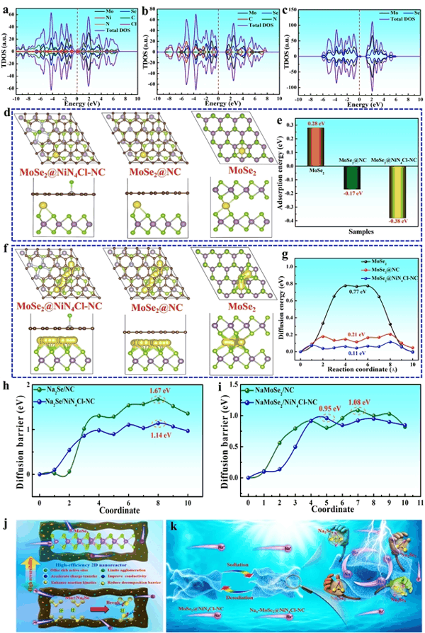 图6 . 电化学性 能的计算见解。(a) MoSe 2 @NiN 4 Cl-NC,(b) MoSe 2 @NC,和(c) MoSe 2 模型的计算态密度谱。(d) 每个吸附了一个Na + 离子的系统的优化结构构型和(e) 计算的Na + 吸附能。(f) 模拟的Na + 扩散路径和(g) 所有三个系统的相应量化能垒。(h) Na 3 Se和(i) NaMoSe 2 在NC和NiN 4 Cl-NC基底上的计算分解能垒。(j) 二维NiN 4 Cl-NC纳米反应器促进MoSe 2 中可逆转化动力学的示意图。(k) MoSe 2 @NiN 4 Cl-NC结构通过催化限域抑制多硒化物迁移的图示。