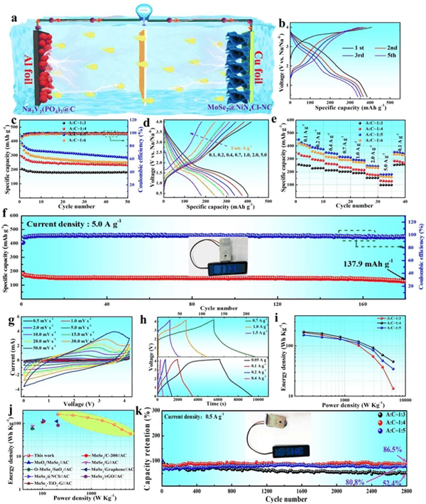 图5 . 实际可行性评估。(a) 全电池配置示意图。(b) MoSe 2 @NiN 4 Cl-NC//NVP@C SIFC在1.0 A g -1 下的初始五次GCD循环和(d) 倍率依赖性GCD曲线。(c) 不同A:C质量比的MoSe 2 @NiN 4 Cl-NC//NVP@C SIFC的循环寿命和(e) 倍率性能比较评估。(f) 采用A:C比为1:5的MoSe 2 @NiN 4 Cl-NC//NVP@C SIFC在5.0 A g -1 下的高倍率循环性能。(g) MoSe 2 @NiN 4 Cl-NC//AC SIHC在0.05-50.0 mV s -1 的宽扫描速率范围内的CV曲线。(h) MoSe 2 @NiN 4 Cl-NC//AC SIHC的倍率依赖性GCD曲线。(i) 不同A:C质量比下的能量/功率密度Ragone图量化。(j) MoSe 2 @NiN 4 Cl-NC//AC SIHC与已报道的MoSe 2 基SIHC的Ragone图比较。(k) 在0.5 A g -1 下基于质量比的循环稳定性分析。