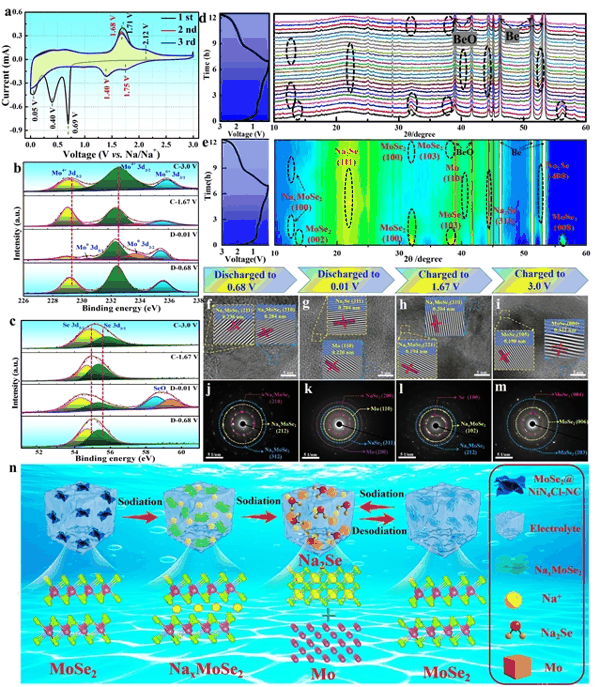 图3 . 通过多技术表征揭示机理。(a) MoSe 2 @NiN 4 Cl-NC在0.5 mV s -1 下记录的CV曲线。在指定电压阶段的非原位XPS分析:(b) Mo 3d核心能级,(c) Se 3d核心能级。(d, e) MoSe 2 @NiN 4 Cl-NC原位XRD图。通过非原位HRTEM/SAED记录的微观结构演化:(f, j) 0.68 V(放电态),(g, k) 0.01 V(深度放电态),(h, l) 1.67 V(充电态),(i, m) 3.0 V(完全充电态)。(n) 总结MoSe2@NiN4Cl-NC中Na + 离子存储机理的概念图。
