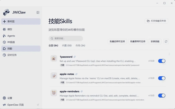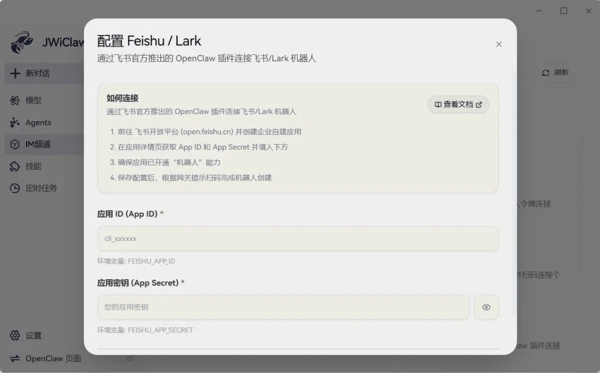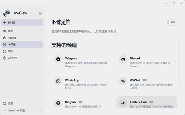 JWiClaw支持一键部署即时通讯频道,用户可通过图形化界面快速接入主流IM工具,如微信、钉钉、飞书、WhatsApp等,实现与各平台的机器人对接,大幅提升JWiClaw在多场景下的沟通效率与部署便捷性。