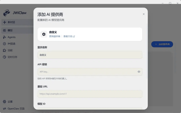 用户可通过简单配置 API 密钥和基础 URL,快速接入本地模型和线上模型。相比原生OpenClaw,JWiClaw 将模型集成过程从命令行操作升级为可视化配置,极大提升部署效率与易用性,真正实现“按需选择、简单方便”的智能体构建体验。