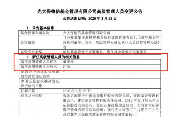日前,光大保德信基金披露一则高管变更公告,公司董事长由汪沛出任,原董事长王翠婷到龄退休。不过目前,公司官网暂未更新汪沛的信息,运营商财经网将做以下梳理。