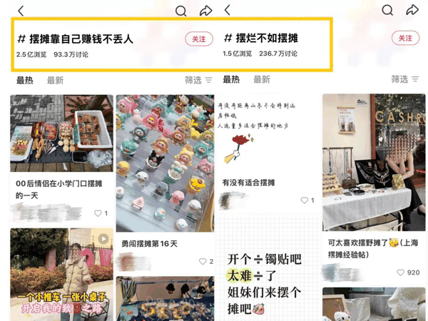 春暖花开,正是逛市集的好时节。 从核心商圈的广场到公园的绿地旁,“非遗市集”“文创市集”几乎遍地开花,形式各异的市集摊位正成为身边随处可见的风景。 在社交平台上,关于市集摆摊的话题也早已突破了上百亿次的播放阅读,“摆烂不如摆摊”“摆摊靠自己赚钱不丢人”也都收获了1.5亿次、2.5亿次的浏览以及近百万次讨论。
