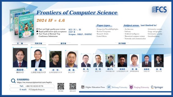 Frontiers of Computer Science (FCS)是由教育部主管、高等教育出版社和北京航空航天大学共同主办,南京大学支持,SpringerNature 公司海外发行的英文学术期刊。本刊于 2007 年创刊,月刊,全球发行。主要刊登计算机科学领域具有创新性的综述论文、研究论文等。本刊主编为周志华 院士 ,共同主编为熊璋教授。编委会及青年 AE 团队由国内外知名学者及优秀青年学者组成。本刊被 SCI、Ei、DBLP、INSPEC、SCOPUS 和中国科学引文数据库(CSCD)核心库等收录,为 CCF 推荐B类期刊;两次入选“中国科技期刊国际影响力提升计划”;入选“第4届中国国际化精品科技期刊”;两次入选“中国科技期刊卓越行动计划”(一期梯队、二期领军)。