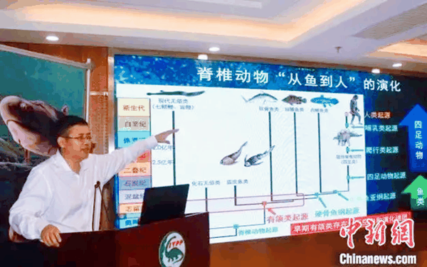 朱敏院士解读脊椎动物“从鱼到人”演化的成果(中新网记者孙自法摄)