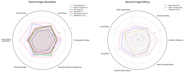 在人类偏好盲测中,“文生图”能力超过GPT-Image1.5和国内主流模型,在文本渲染、照片级成像和世界知识指标上,接近Nano Banana Pro。