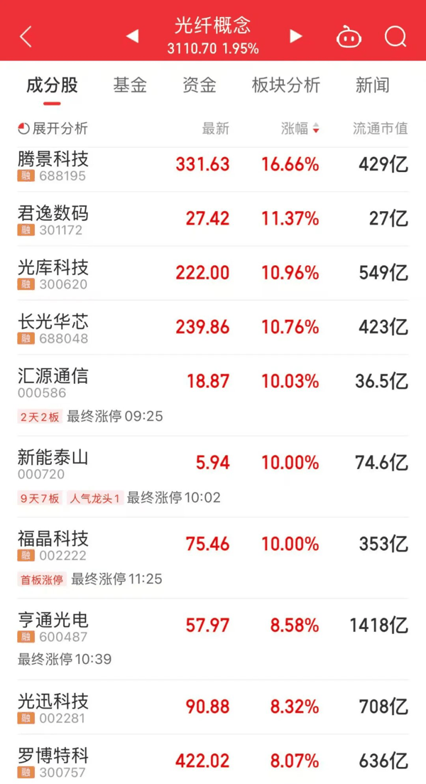 今天上午,A股继续调整,光 通信 产业链逆势走强,其中,大光、小光、新光齐涨, 中际旭创 、 新易盛 上涨, 德科立 、 长光华芯 、 腾景科技 、 光库科技 、 炬光科技 等个股大涨,股价均创历史新高。值得注意的是,另一个“光”,光纤板块也上涨,两大龙头股 亨通光电 、 长飞光纤 大涨,股价均创历史新高。