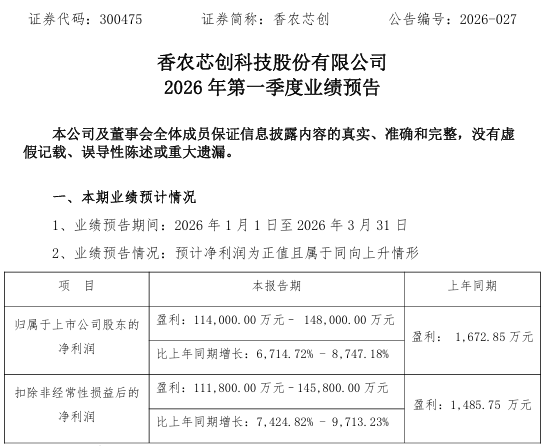 4月7日晚间, 香农芯创 发布业绩预告称,2026年第一季度,公司预计归母净利润同比增长6714.72%至8747.18%,扣非后净利润同比增长7424.82%至9713.23%。