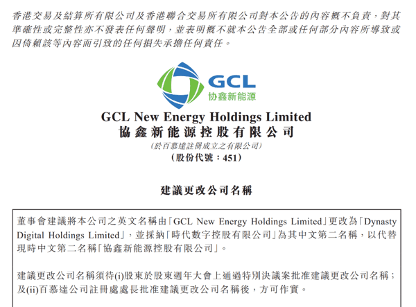 3月30日晚间,协鑫新能源发布公告称,计划更名为“时代数字控股有限公司”,理由是:主动顺应 数字经济 与新能源产业融合发展趋势,深度融合AI大模型与 Web3.0 技术。