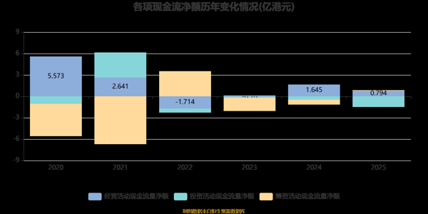 2025年,公司经营活动现金流净额为7942万港元,同比下降51.72%;筹资活动现金流净额325.5万港元,同比增加6974万港元;投资活动现金流净额-1.47亿港元,上年同期为-4751.8万港元。