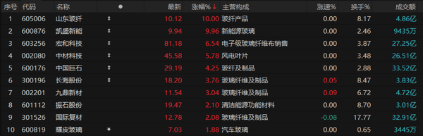 4月10日, 玻璃玻纤 板块大涨, 山东玻纤 、 凯盛新能 涨停, 宏和科技 、 中材科技 、 中国巨石 等跟涨。
