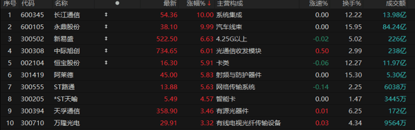 4月10日, 通信设备 板块午后震荡走强, 长江通信 、 永鼎股份 涨停, 恒宝股份 、 新易盛 、 中际旭创 等跟涨。