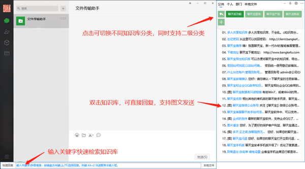 启动聊天宝软件后,聊天宝会吸附在QQ或微信等聊天窗口的右侧和底部。右侧显示了公共知识库和个人知识库,以及知识库分类,点击右侧知识库,可以一键发送。底部提供了关键字检索功能和常见问题功能。支持关键字以及拼音快速检索回复内容,一键发送。