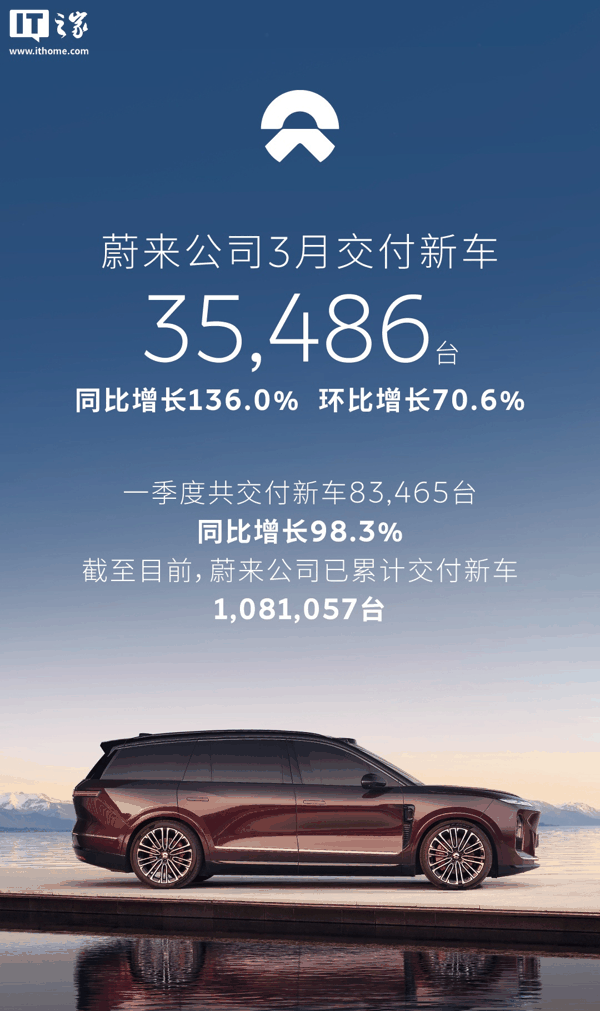 IT之家 4 月 1 日消息,蔚来官方今日宣布,2026 年 3 月,蔚来公司交付新车 35,486 台,同比增长 136.0%,环比增长 70.6%。