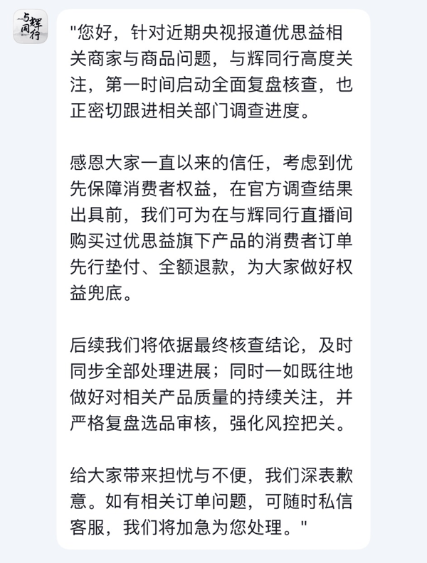 与辉同行就带货优思益致歉:将为用户先行垫付、全额退款