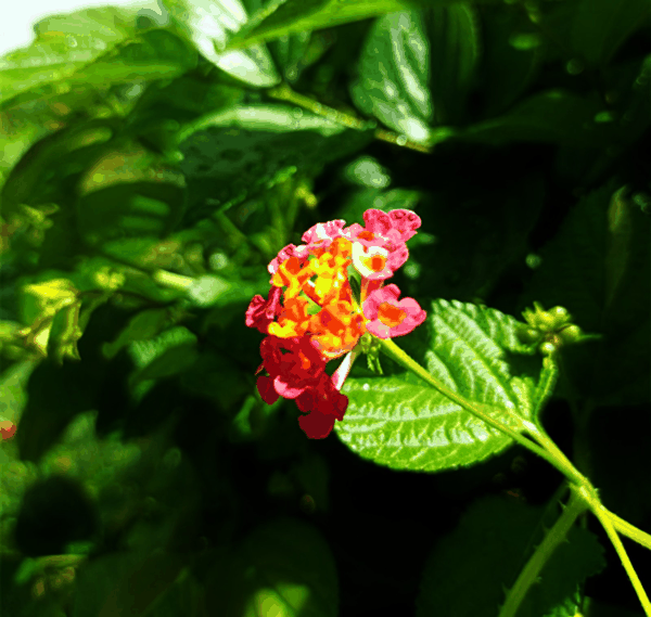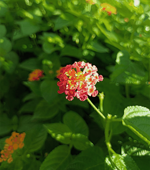 【 原形态 】 马缨丹,直立或蔓性灌木。植株有臭味,高 1-2m ,有时呈藤状,长可达 4m 。茎、枝均呈四方形,有糙毛,常有下弯的钩刺或无刺。单叶对生;叶柄长约 1cm ;叶片卵形至卵状长圆形,长 3-9cm ,宽 1.5-5cm ,基部楔形或心形,边缘有钝齿,先端渐尖或急尖,表面有粗糙的皱纹和短柔毛,背面具小刚毛,侧脉约 5 对。头状花序腋生,花序直径 1.5-2.5cm ;花序醒粗壮,长于顺柄;苞片披针莆,长为花萼的 1-3 倍,有短柔毛;花萼筒状,先端有极短的齿;花冠黄色、橙色、粉红色至深红色,花冠管长约 1cm ,两面均有细短毛,直径 4-6cm ;雄蕊 4 ,内藏果实圆球形,成熟时紫黑色。全年开花。