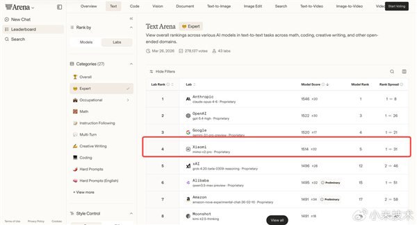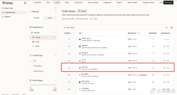 在衡量实验室综合研发实力的Lab Rank(实验室排名)维度, 小米拿下Text Arena(Arena Expert)全球第四、Code Arena全球第五的优异成绩。