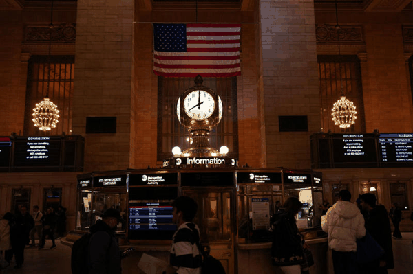 当地时间2026年4月7日,美国纽约,纽约中央车站里的时钟显示美国东部时间晚上8点,这是特朗普为伊朗开放霍尔木兹海峡设定的最后期限。图/IC photo