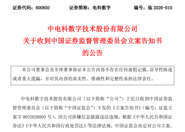 4月3日晚间,A股上市公司 电科数字 发布公告称,其于近日收到中国证监会下发的《立案告知书》。因 电科数字 涉嫌信息披露违法违规,证监会决定对该公司立案。