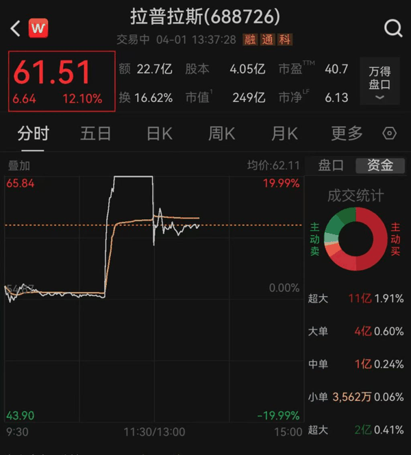 4月1日近11时,受一则“ 拉普拉斯 中标 特斯拉 光伏项目第二期,订单规模近百亿”的报道影响,A股上市公司 拉普拉斯 (688726.SH)股价瞬间拉升,短短8分钟内日内涨幅从0.38%扩大至19.99%,一直到午间收盘封死涨停。