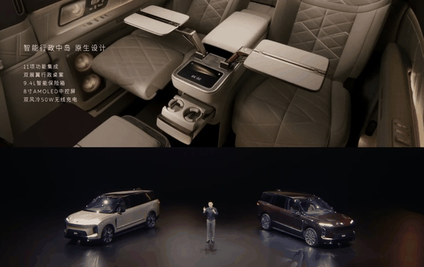 二排储物和视听方面,蔚来安排了两块 16 英寸的娱乐屏,下方是一个支持从零下 2°C 无级调节到 55°C 的压缩机冰箱,中岛内部还安置了一个支持数字密码解锁的独立保险箱。