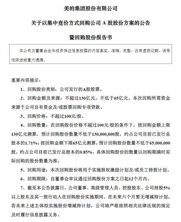 3月30日晚间, 美的集团 (000333.SZ)披露最新回购预案,拟以集中竞价方式回购A股股份,金额区间为65亿元至130亿元,回购价格上限100元/股,预计回购股份6500万至1.3亿股,占总股本的0.85%至1.71%。