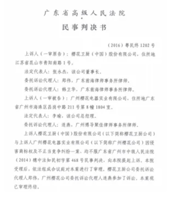 为维护品牌权益,樱花开启了长期的维权之路,2015年樱花与苏州樱花、中山樱花的商标侵权案一审判决出炉,相关企业被判侵权赔偿,但未要求变更企业名称;2016年江苏省高级人民法院做出二审终审判决,判定苏州樱花、中山樱花相关企业立即停止将“樱花”作为企业字号,并在一个月内办理名称变更手续,线上线下销售相关产品均构成侵权。