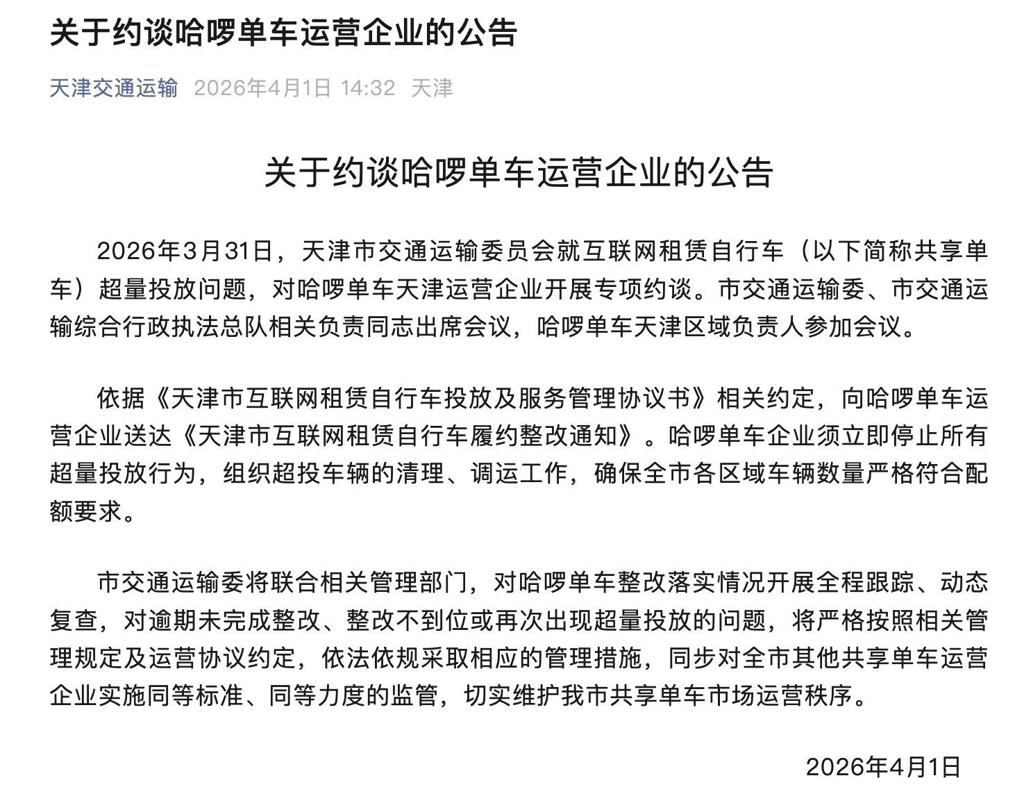 中新网 4月1日电(吴家驹)4月1日,天津市交通运输委员会公众号发布公告,2026年3月31日,天津市交通运输委员会就互联网租赁自行车(共享单车)超量投放问题,对哈啰单车天津运营企业开展专项约谈。