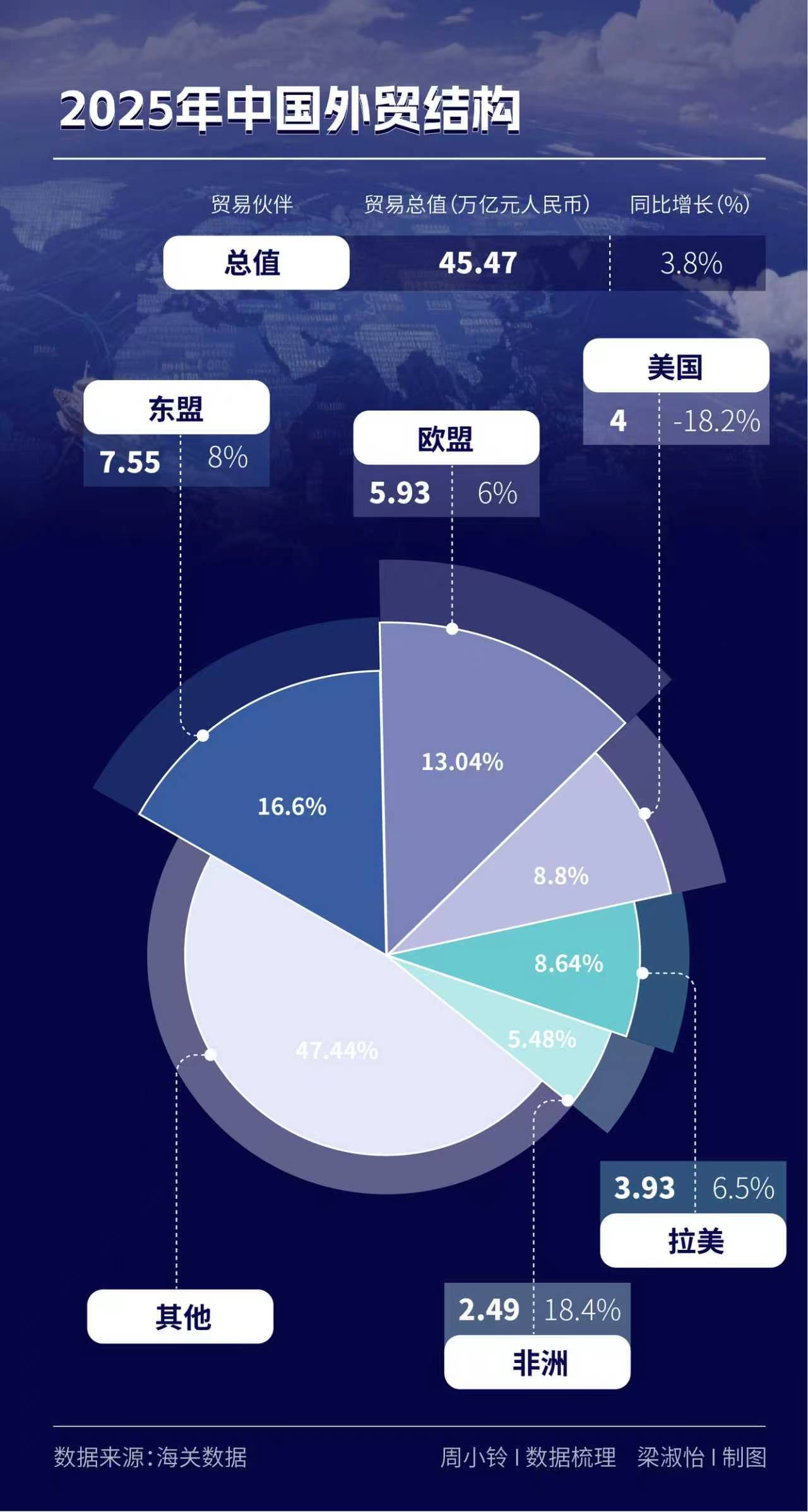 从2025年贸易总额来看,东盟增长8%,欧盟增长6%,拉美增长6.5%,非洲增长18.4%。东盟、欧盟、美国是中国前三大贸易伙伴。共建“一带一路”国家贸易占比超过一半。