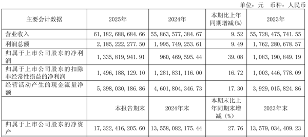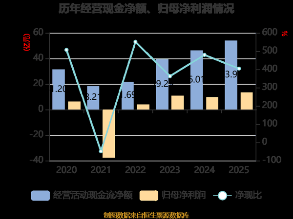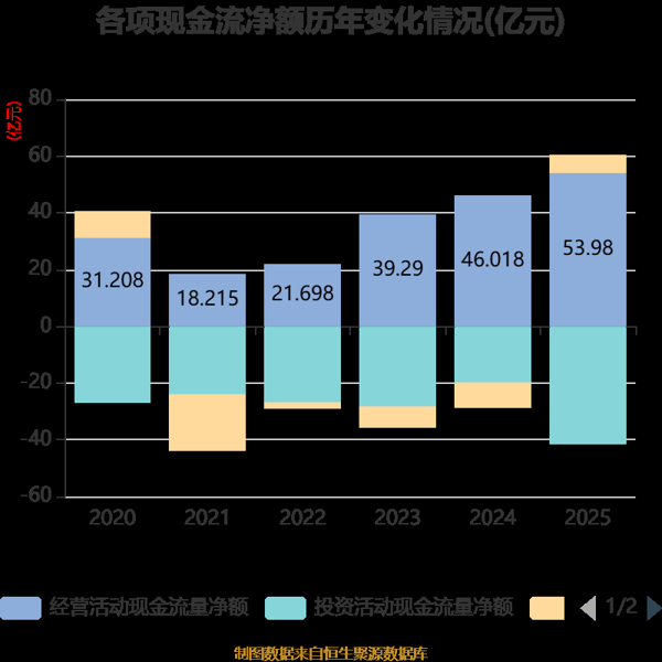 截至2025年,公司经营活动现金流净额为53.98亿元,同比增长17.3%;筹资活动现金流净额6.44亿元,同比增加15.15亿元;投资活动现金流净额-41.45亿元,上年同期为-19.88亿元。