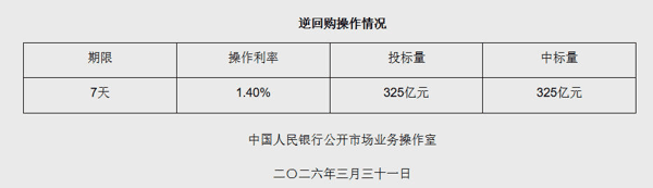 中新网 3月31日电 据央行网站消息,2026年3月31日中国人民银行以固定利率、数量招标方式开展了325亿元7天期逆回购操作。具体情况如下: