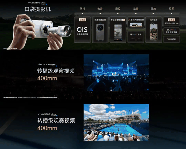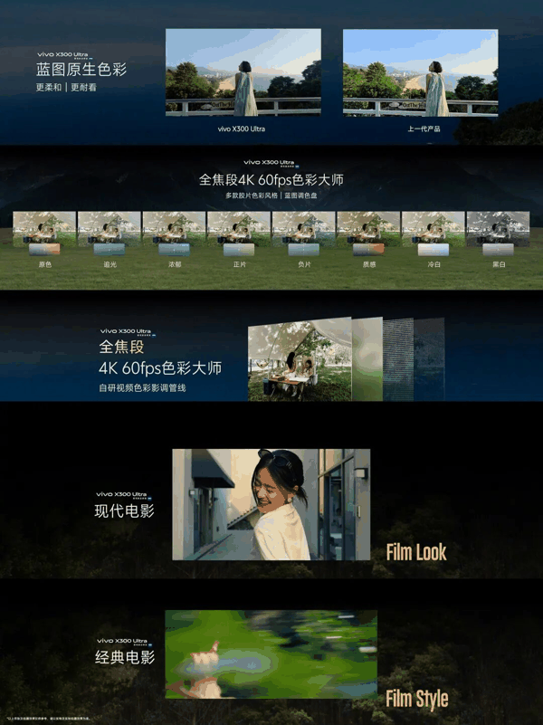 性能与视频拍摄方面,vivo X300 Ultra搭载第五代骁龙8至尊版处理器,号称“口袋摄影机”,支持全焦段4K 120fps杜比视界直出,配备全链路专业视频工作流,可实现全焦段4K 120fps 10bit Log录制、422采样及全焦段OIS光学视频防抖,搭配四麦克风阵列与专业录像模式Pro,可满足转播级观演观赛视频拍摄需求;同时提供经典电影、现代电影两种电影风格模式,支持2.4:1宽银幕画幅、24fps黄金帧率等,直出电影感画面。