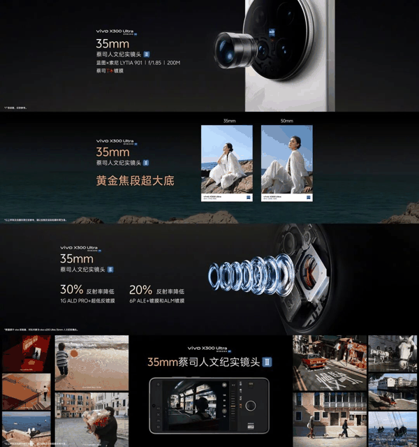 2亿像素35mm蔡司人文纪实镜头,搭载蓝图×索尼LYTIA 901传感器(1/1.12英寸超大底),配备1G+6P镜片结构与蔡司T*镀膜,单像素感光面积和满陷容量分别提升30%和32%,支持原生35mm光学直出,搭配多重降噪及HDR技术,兼顾画质与真实色彩。
