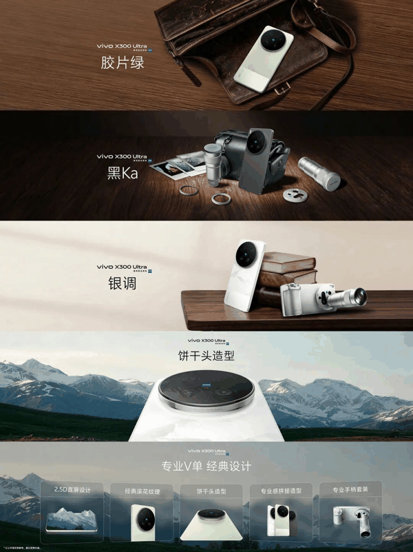 外观设计上,vivo X300 Ultra采用类似相机“饼干头”的DECO造型,简约大气且无多余装饰,中框边缘复刻经典相机滚花纹理与标志性银边,还原专业相机的细节质感,正面则采用2.5D直屏设计。配色方面,新机推出全新“胶片绿”配色,兼具老镜头独有的油润感,同时保留“黑Ka”“银调”两款经典配色,其中“银调”配色融入雪山纹理,将光影与山脊轮廓定格于背板玻璃,质感出众。